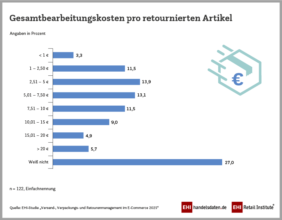 Die Bearbeitungskosten für Retouren liegt bei den meisten Unternehmen im E-Commerce im mittleren einstelligen Bereich, so ein Ergebnis der aktuellen EHI-Studie „Versand-, Verpackungs- und Retourenmanagement im E-Commerce 2025“.