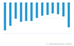 Die vorliegende Grafik zeigt die monatliche Entwicklung der Verbraucherpreise für Gas, einschließlich Betriebskosten, in Deutschland von Januar 2025 bis Januar 2026 jeweils zum Vorjahresmonat (in Prozent).