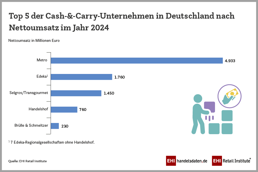 Nach Berechnungen des EHI Retail Institute gab es zum Stichtag 1. Januar 2025 in Deutschland insgesamt 321 Cash-&-Carry-Märkte. Der Gesamtumsatz (netto) der Branche belief sich im Jahr 2024 auf rund 10,05 Milliarden Euro.