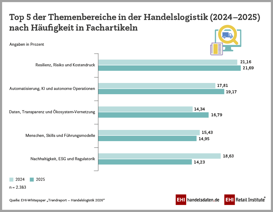 Die Handelslogistik bewegt sich im Spannungsfeld zwischen strategischer Neuorientierung und operativer Umsetzung. Aktuelle geopolitische Konflikte, volatile Transportmärkte und instabile Energiepreise machen globale Lieferketten dauerhaft störanfällig. Gleichzeitig verschärfen Omnichannel-Strukturen, steigende Serviceanforderungen, hohe Retourenquoten und neue Fulfillment-Konzepte den Wettbewerb. Mit dem „Trendreport – Handelslogistik 2026“ analysiert das EHI den medialen Diskurs in führenden Fachmedien und leitet daraus Trendthemen der Branche sowie Handlungsempfehlungen für Händler ab.