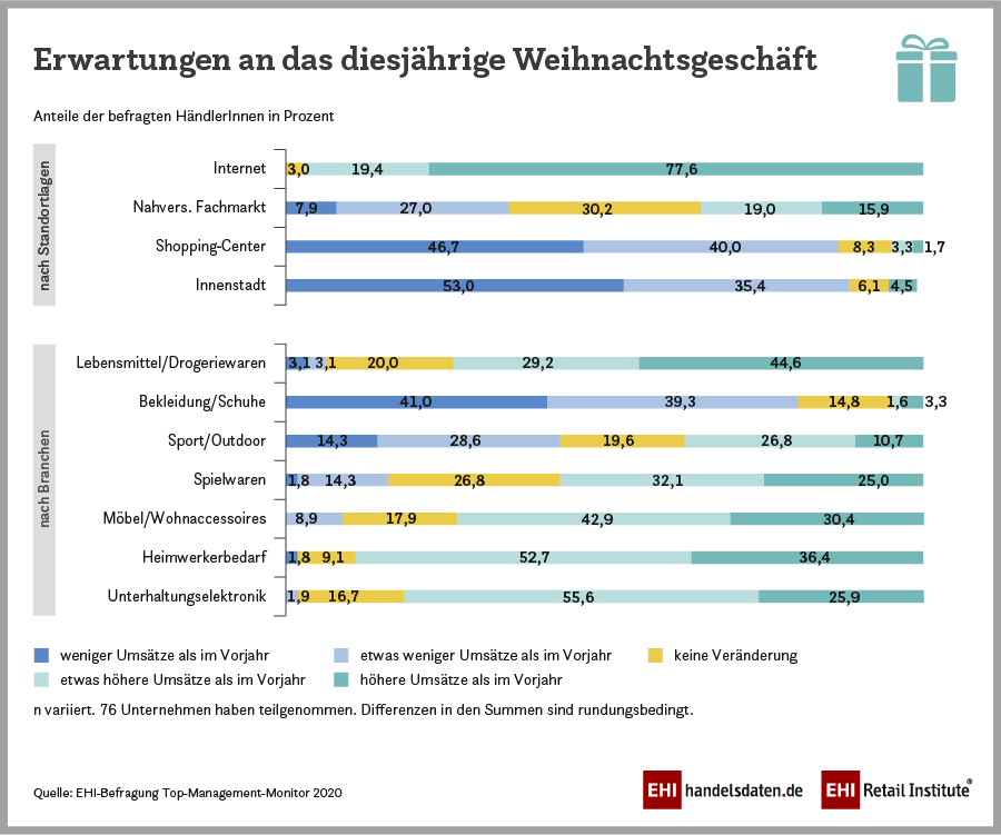 Das Weihnachtsgeschäft 2020 ist in vollem Gange. Der erste Adventssamstag und der Black Friday sind schon gelaufen. Aber welche Erwartungen haben die Unternehmer und Unternehmerinnen selbst an das Weihnachtsgeschäft in diesem ungewöhnlichen Jahr? Das hat Michael Gerling im Top-Management-Monitor gefragt. Ein Ergebnis überrascht nicht: Die Befragten erwarten im Hinblick auf die Standorte, dass in den Shopping-Centern und vor allem in den Innenstädten deutlich geringere Umsätze erzielt werden als noch im Vorjahr. Im Internet rechnen aber fast alle (97 Prozent) mit etwas höheren oder höheren Umsätzen als im Vorjahr. Bei den Nahversorgungszentren und Fachmarktzentren gibt es ein geteiltes Bild und 30,2 Prozent erwarten gegenüber dem Vorjahresgeschäft keine Veränderung. Bei den Branchen sind einige mit guten bis sehr guten Erwartungen an das Weihnachtsgeschäft dabei.