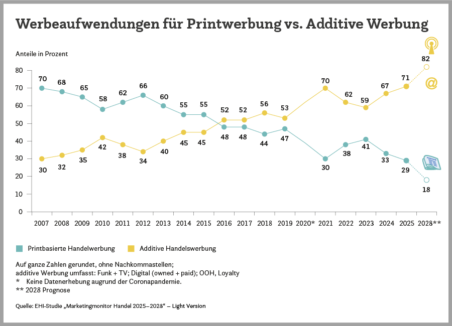 In der Langzeitbetrachtung von printbasierter gegenüber additiver Handelswerbung (vornehmlich digitale Kanäle, aber auch Out-Of-Home) wird die besonders in den letzten Jahren immer rasantere Entwicklung des Werbeverhaltens im deutschen Handel deutlich.